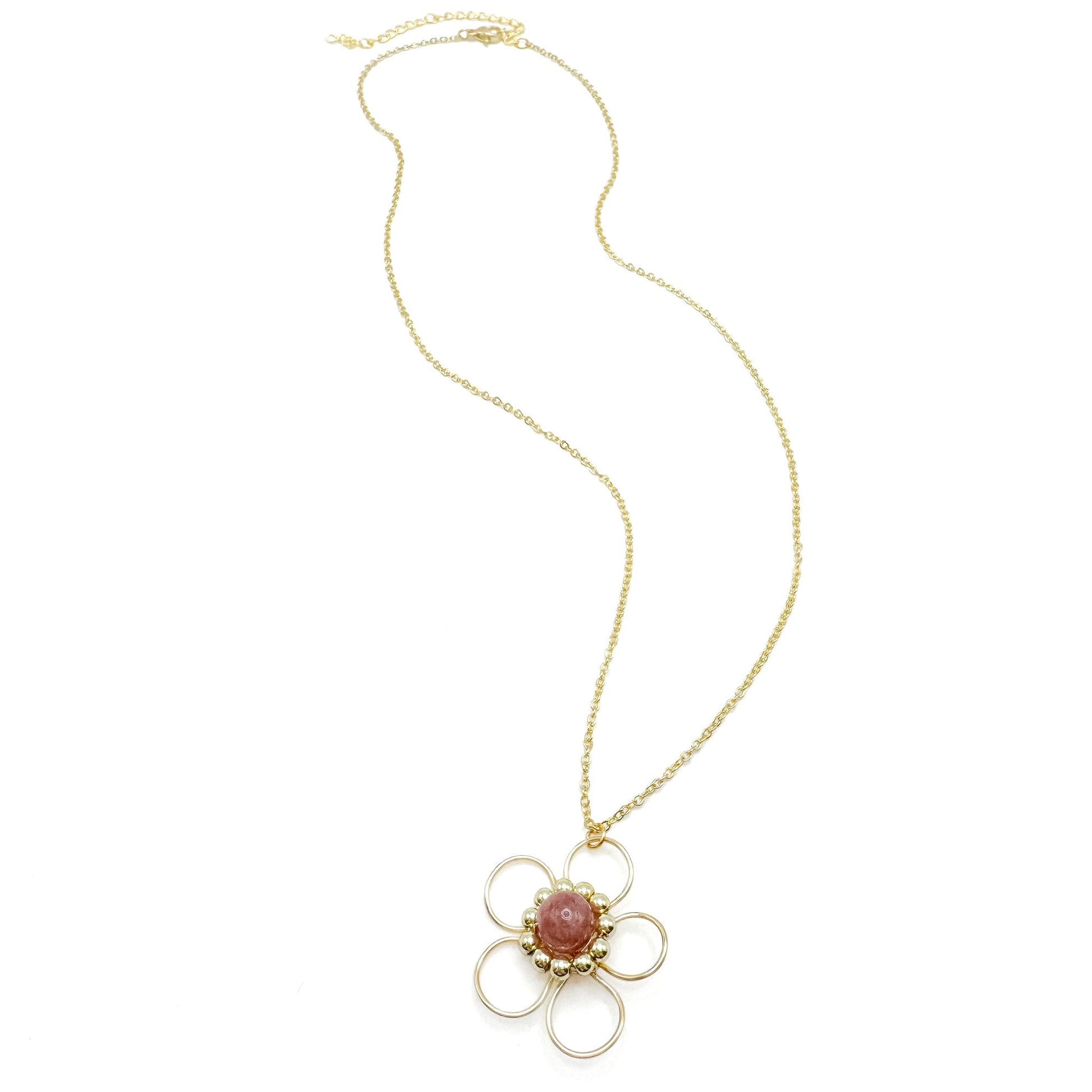 Dusty rose agate forms the center of this gold wire blossom pendant. Hanging from a 20 inch chain with 3 inch extender and lobster clasp, adjust it to fit your scoop, v neck or jeweled neckline.