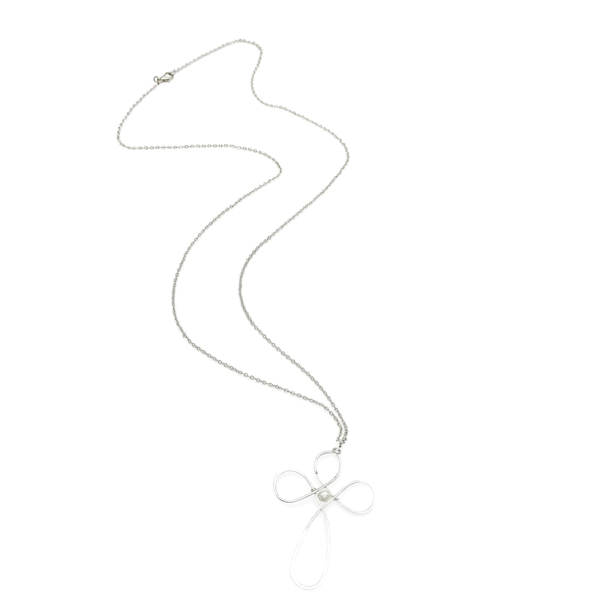 This stunning 2 inch silver wire cross pendant with a 6mm freshwater pearl at its center will carry your summer look into fall and beyond. The 27 inch silver cable chain is secured with a lobster clasp.