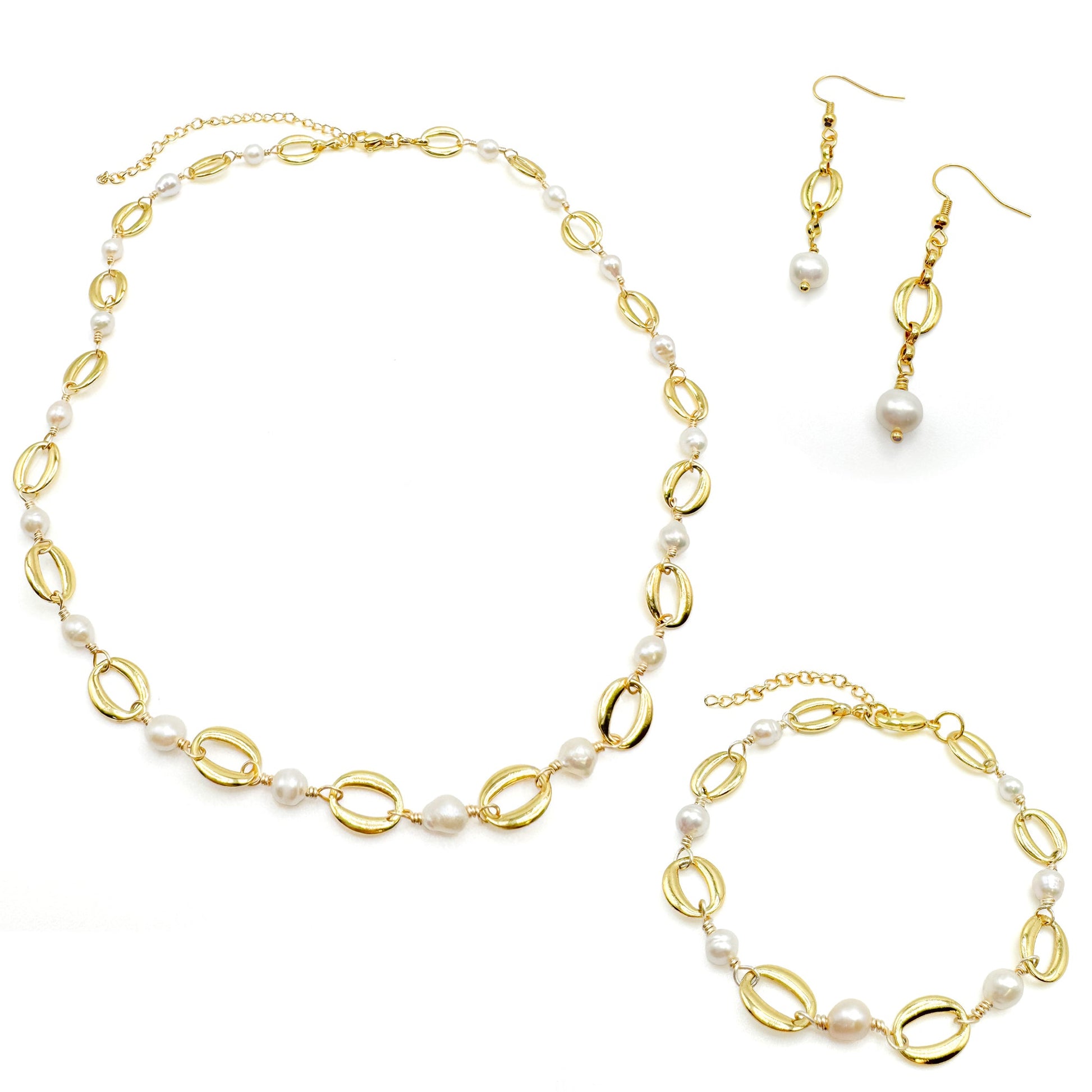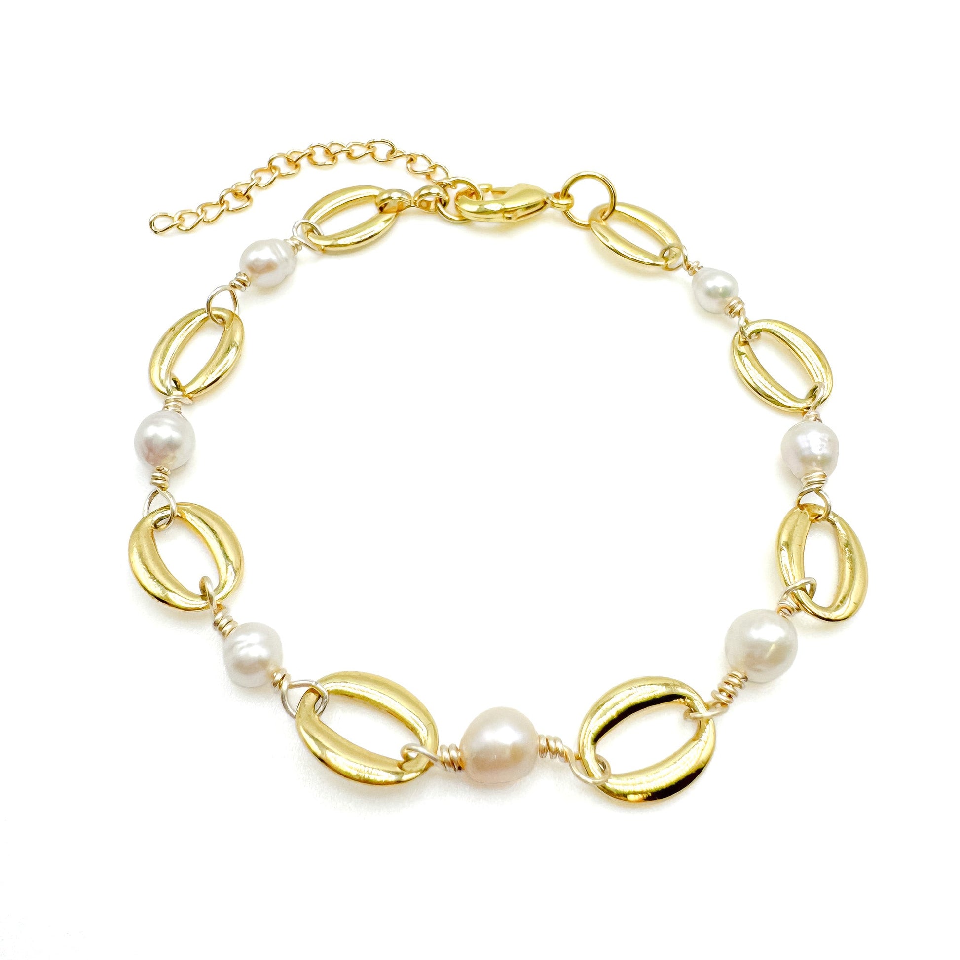 Wire wrapped freshwater pearls and bold oval gold links form this 7 - 8 1/2 inch link bracelet. Use it to extend the length of the matching Coastline necklace.