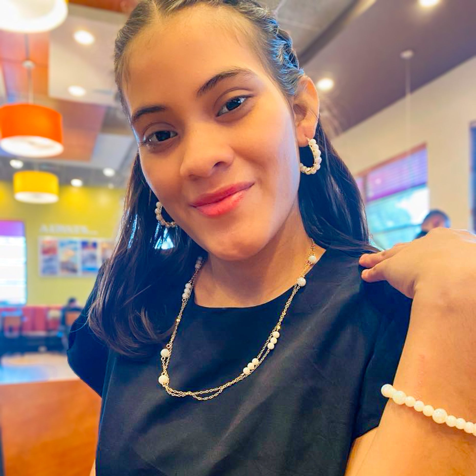 Gold plated chain and stations of white pearlescent crystals in alternating patterns of 1 large crystal and 3 small crystals. Infinity designed with no clasp and total length of 47 inches, wrap it twice around your neck and layer with all your favorite pendants.