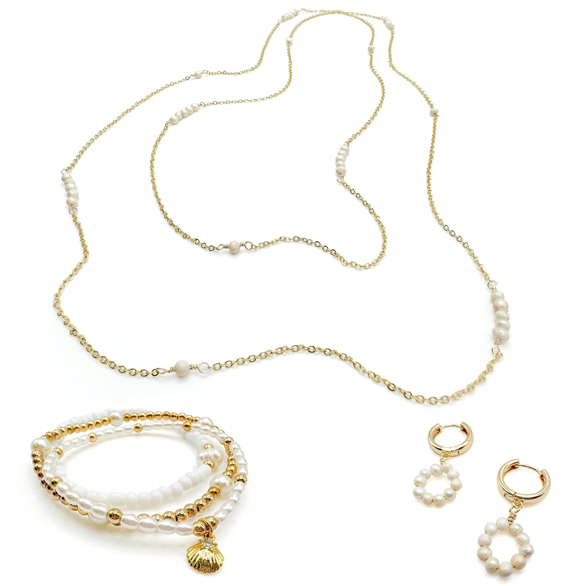 Creamy freshwater pearls alternate in stations of 1 and 5 on this gold 46 inch infinity chain.