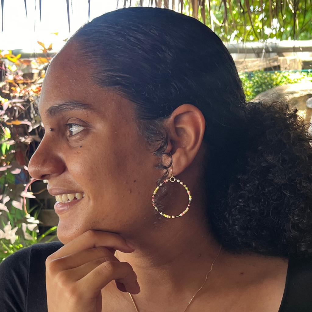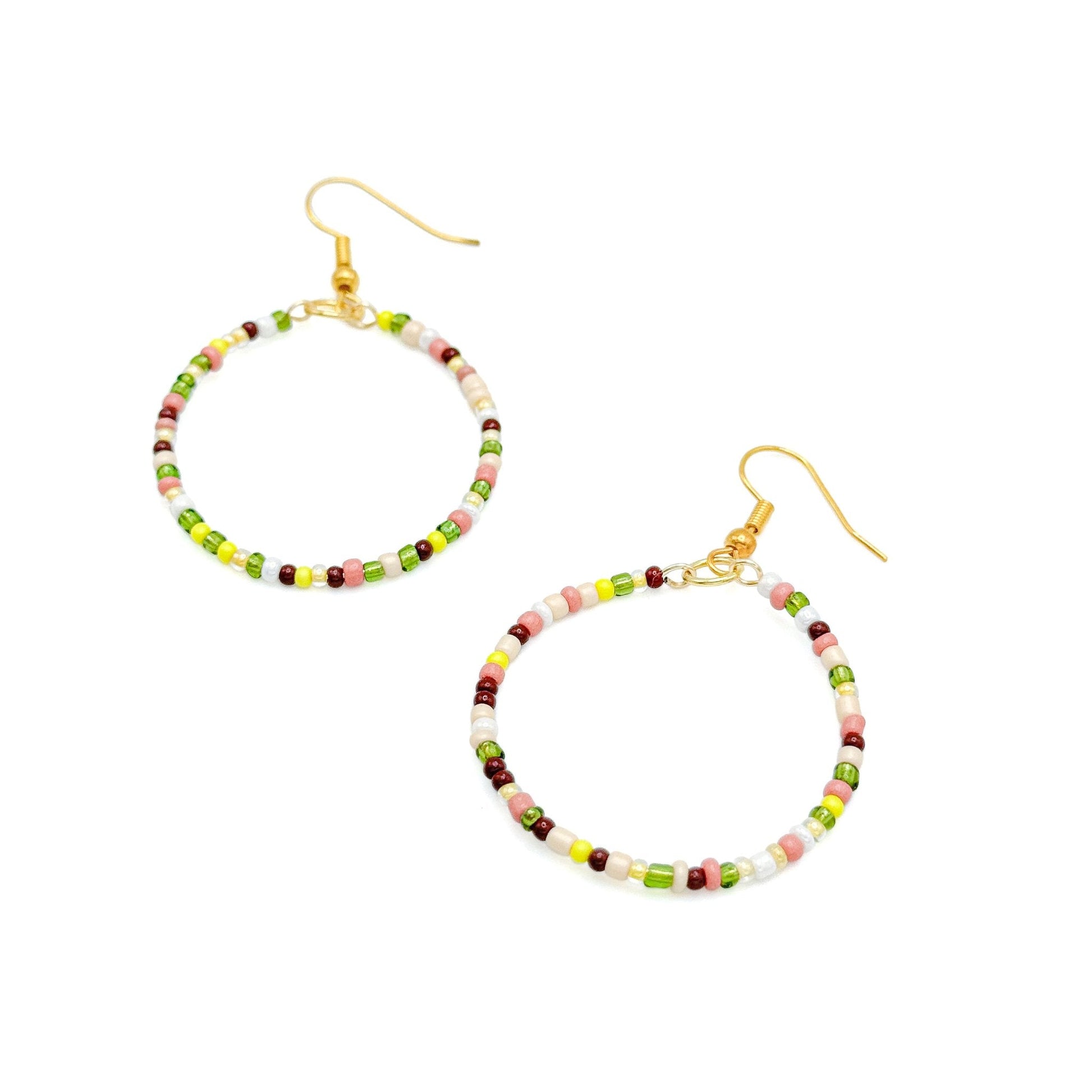 A brilliantly hued, light weight earring that brings all the sunshine to every fall outfit! Tiny seed beads in shades of burgundy, peach, olive, yellow, cream and white on a 1 1/2 inch diameter gold wire, suspended from a gold-plated fishhook.