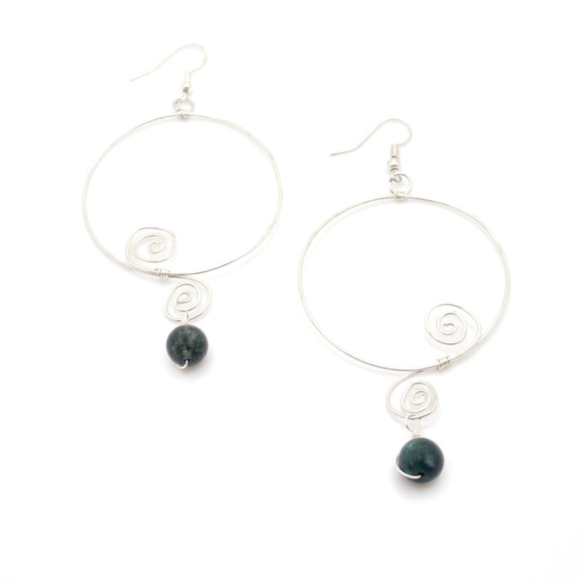 Statement earrings have never been so lightweight! A 1 3/4 inch loop of sterling silver wire dangling from a sterling silver fishhook ends in two mirror image hand-wired swirls on the bottom of the circle, and a genuine agate stone dangle finishes the bottom swirl.