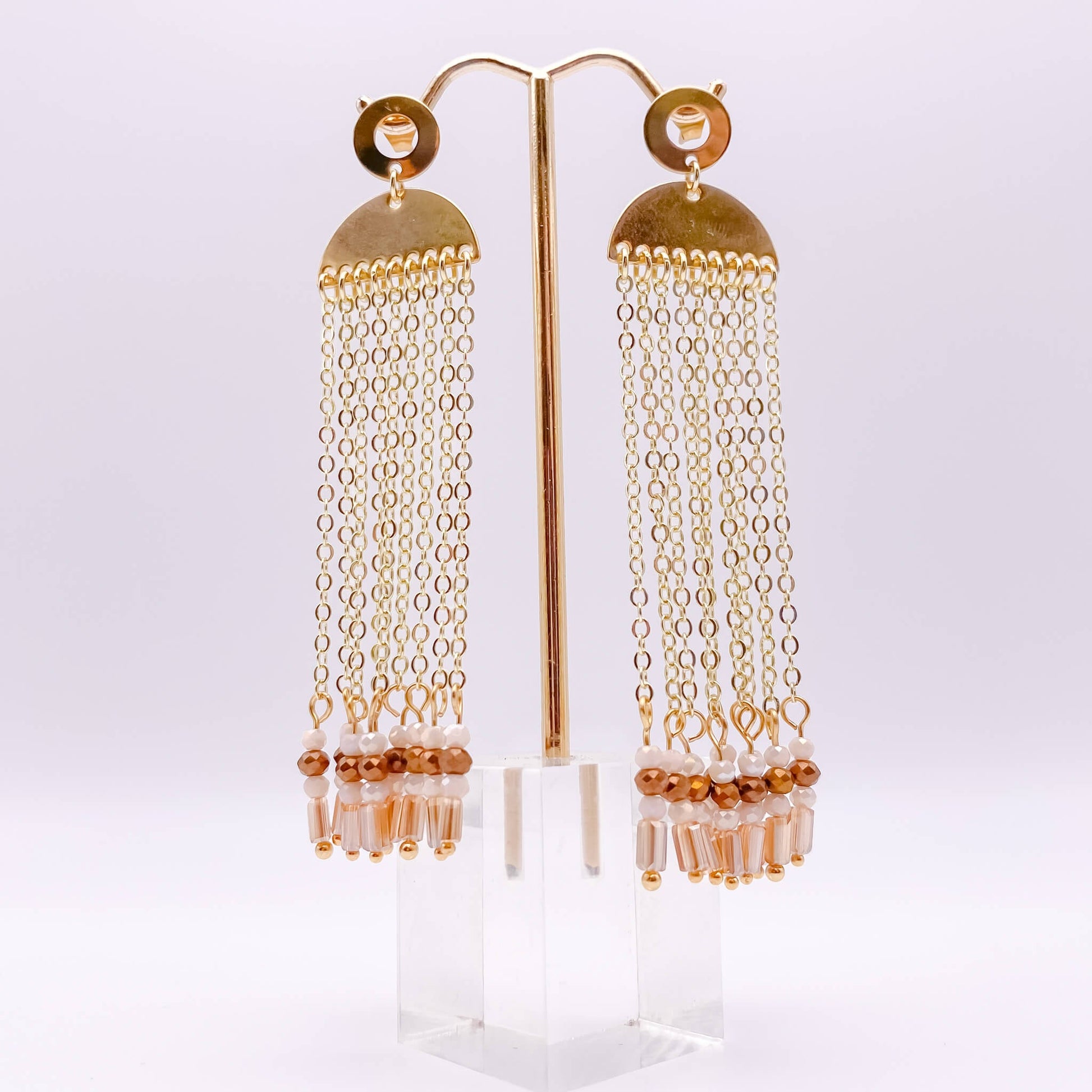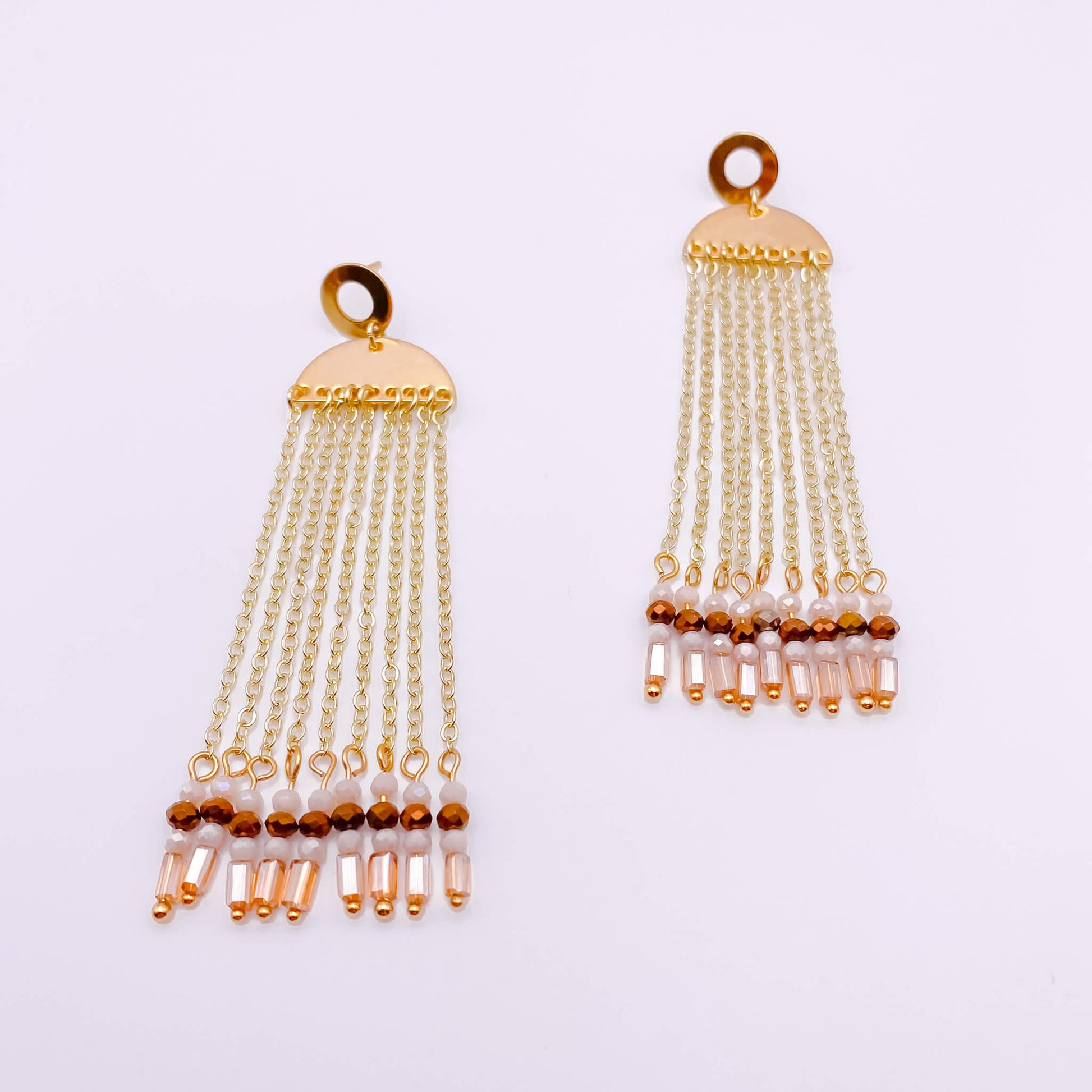A gold filled circle attached to a post holds the half-moon fold filled finding which holds 9 dainty gold plated cable chains ending in a cream, brown and golden faceted crystal on a gold head pin.