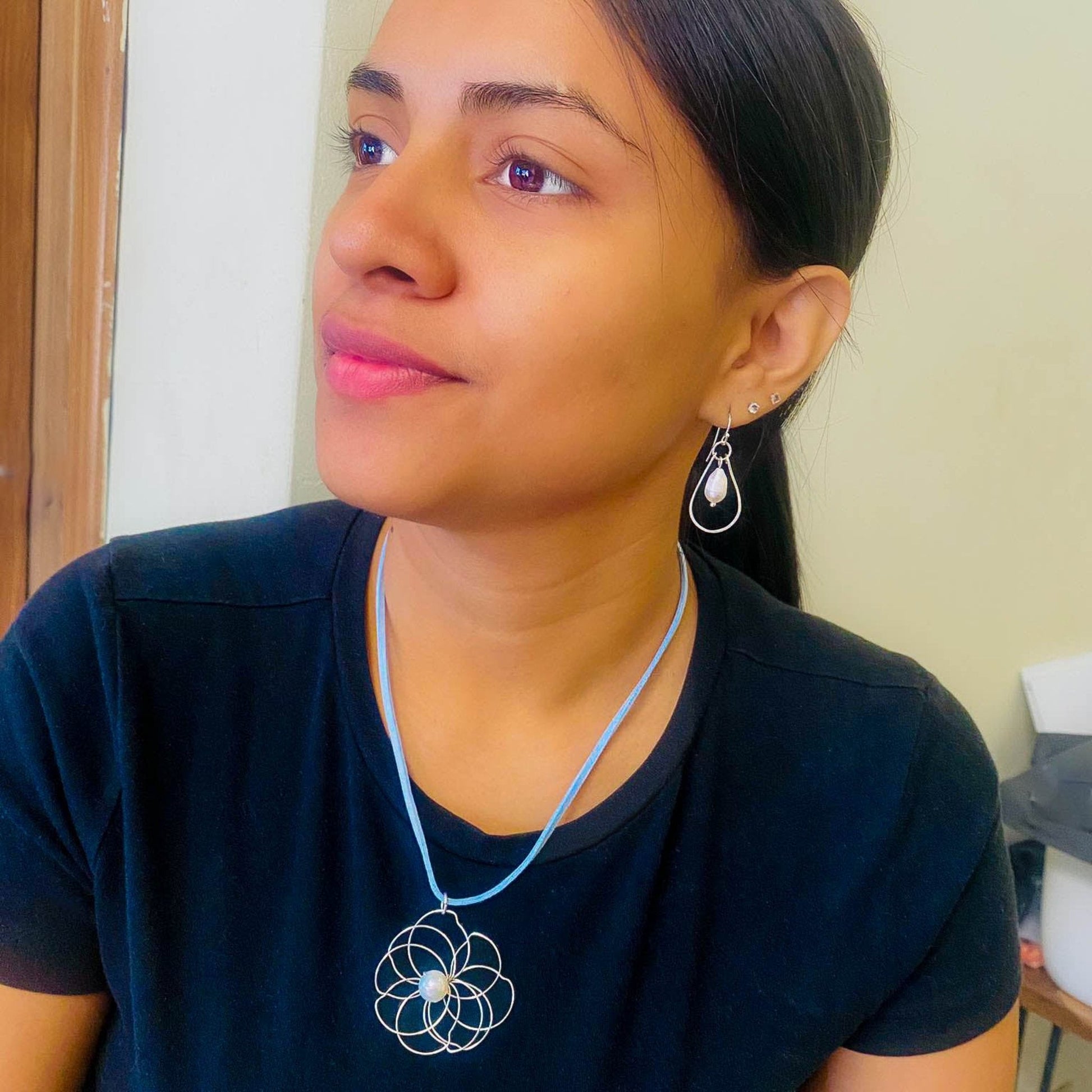 Silver plated wire petals blossom into a flower 2 inches in diameter and completed with a single 10mm freshwater pearl center. The 17 inch light blue suede necklace features a 3 inch extender and lobster claw closure.