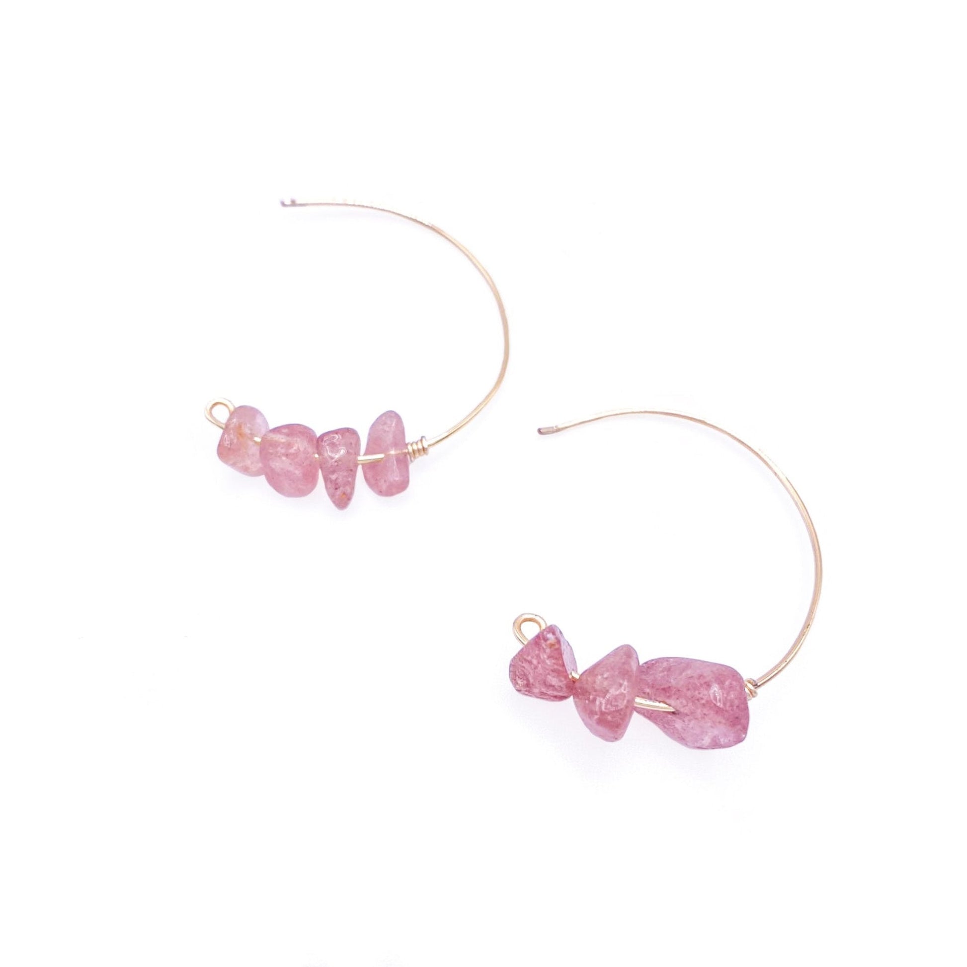 Not your ordinary hoop! These hand formed wire hoops have a cluster of strawberry quartz chips on the end. Pair it up with the new Satin necklace and the Cameo bracelet.