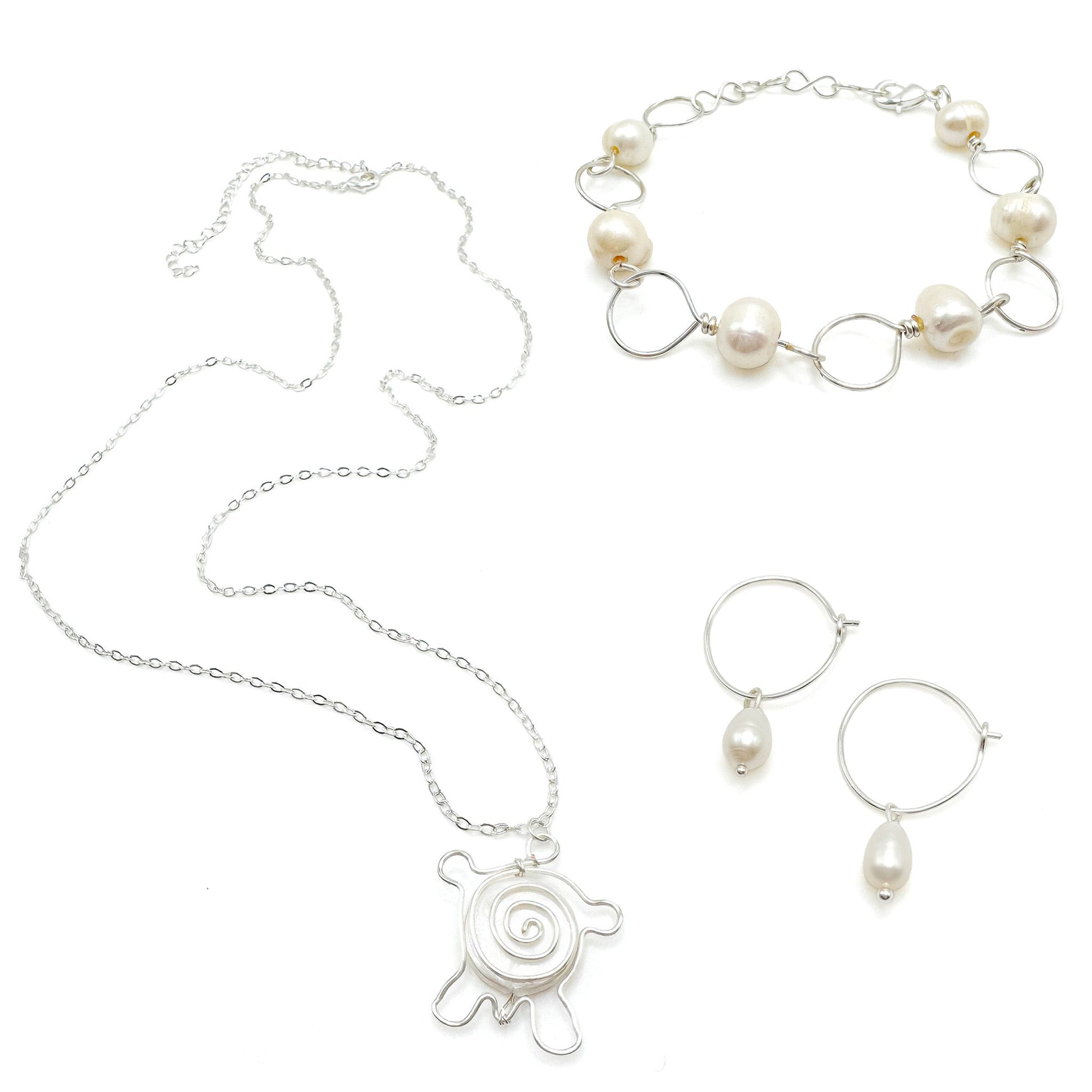 Bringing back our adorable sea turtle design with silver this summer! The Sydney pendant sports a mother of pearl shell and swirls of silver plated wire, and hangs on a a 24-27 inch chain with a lobster clasp and 3 inch extender.